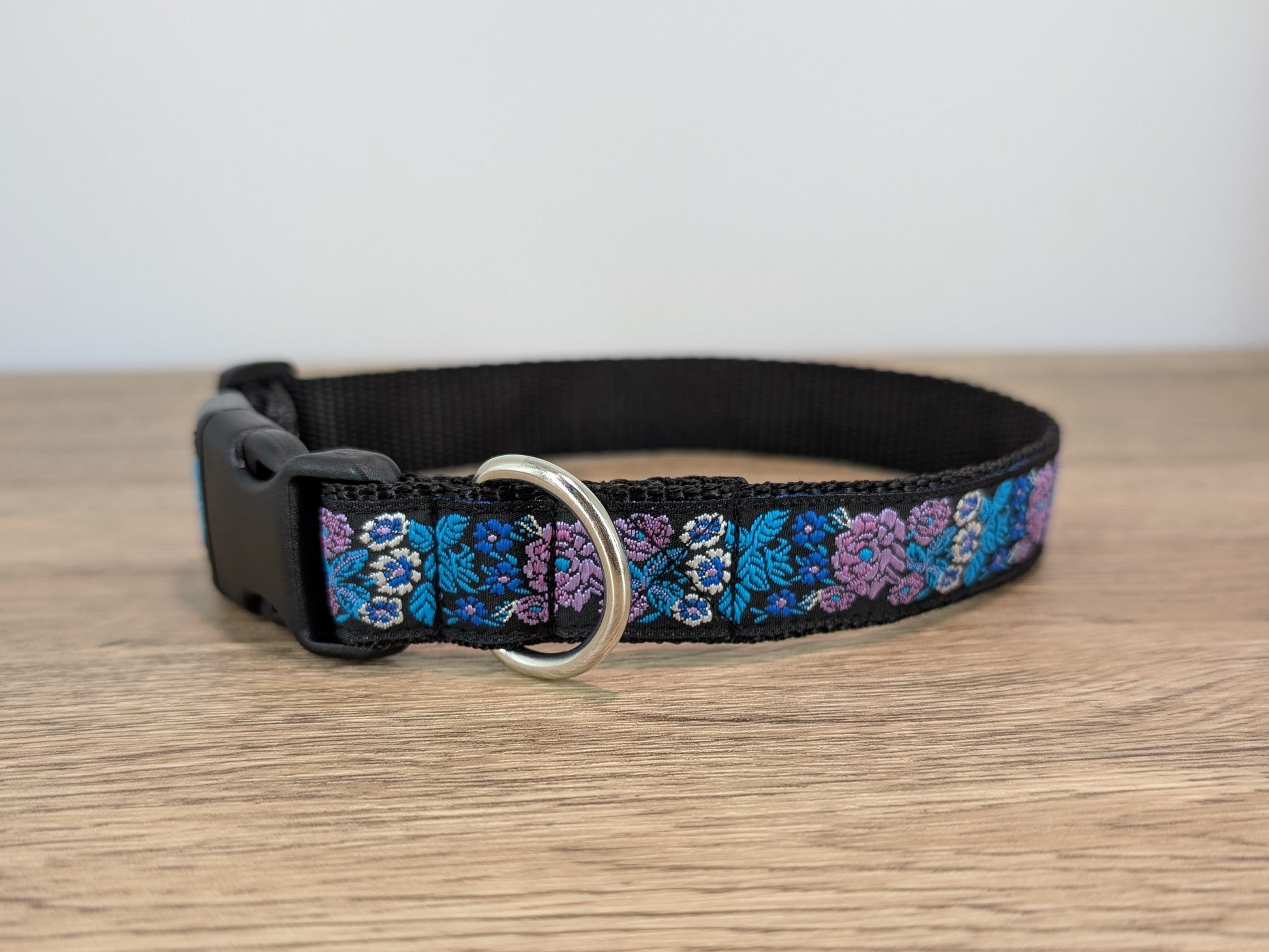 This designer dog collar is ideal for those who like a touch of elegance, featuring a blue and lilac floral pattern on a black background.
