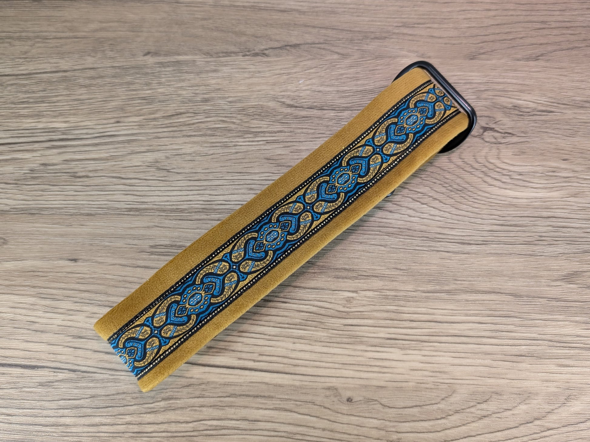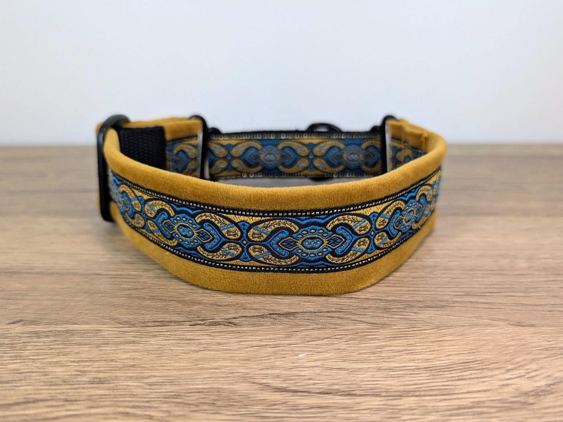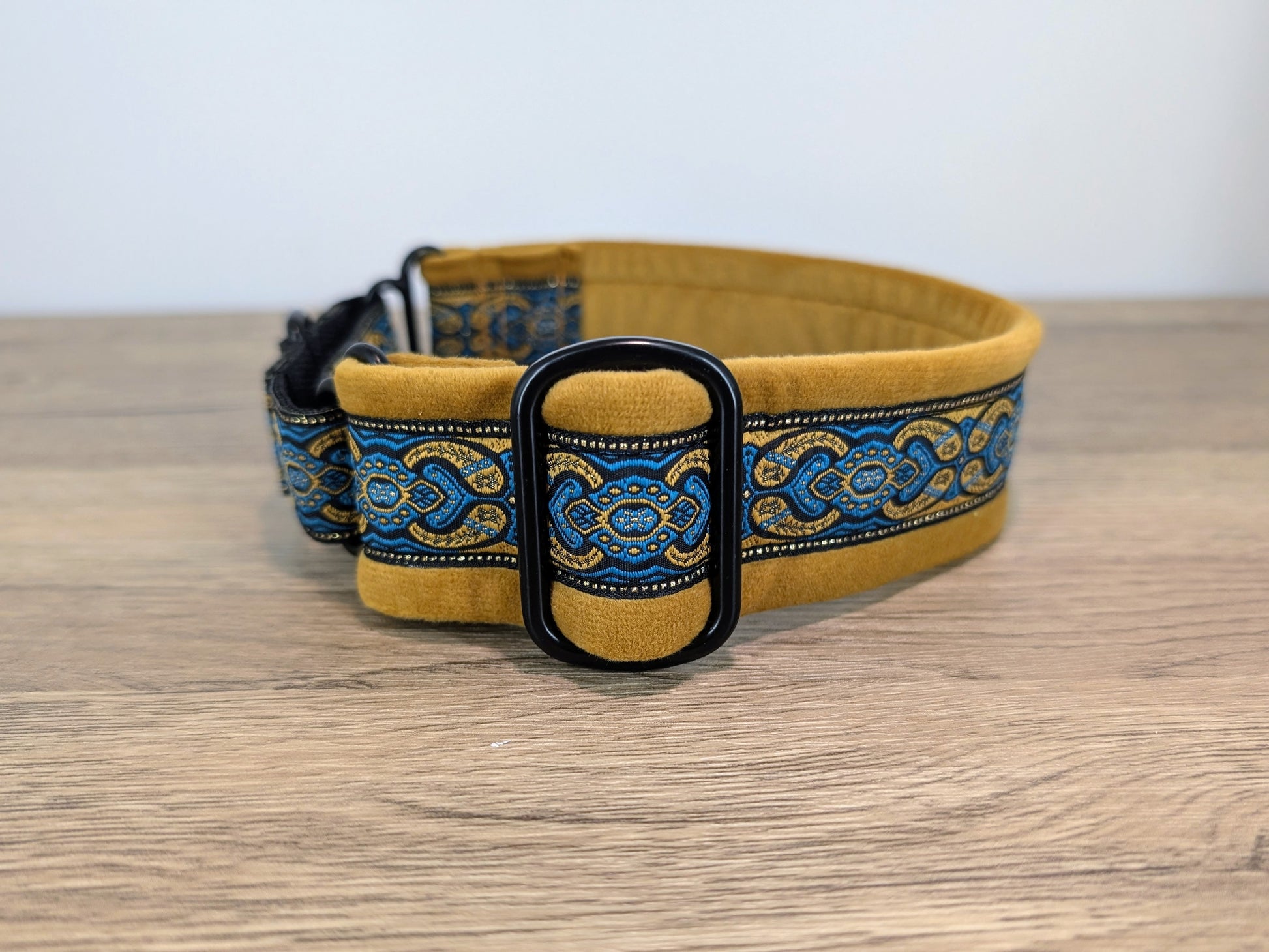 This handmade Barkley Dogwear dog collar features a black, gold and blue pattern and gold velvet with a martingale fitting that is designed for style and comfort.