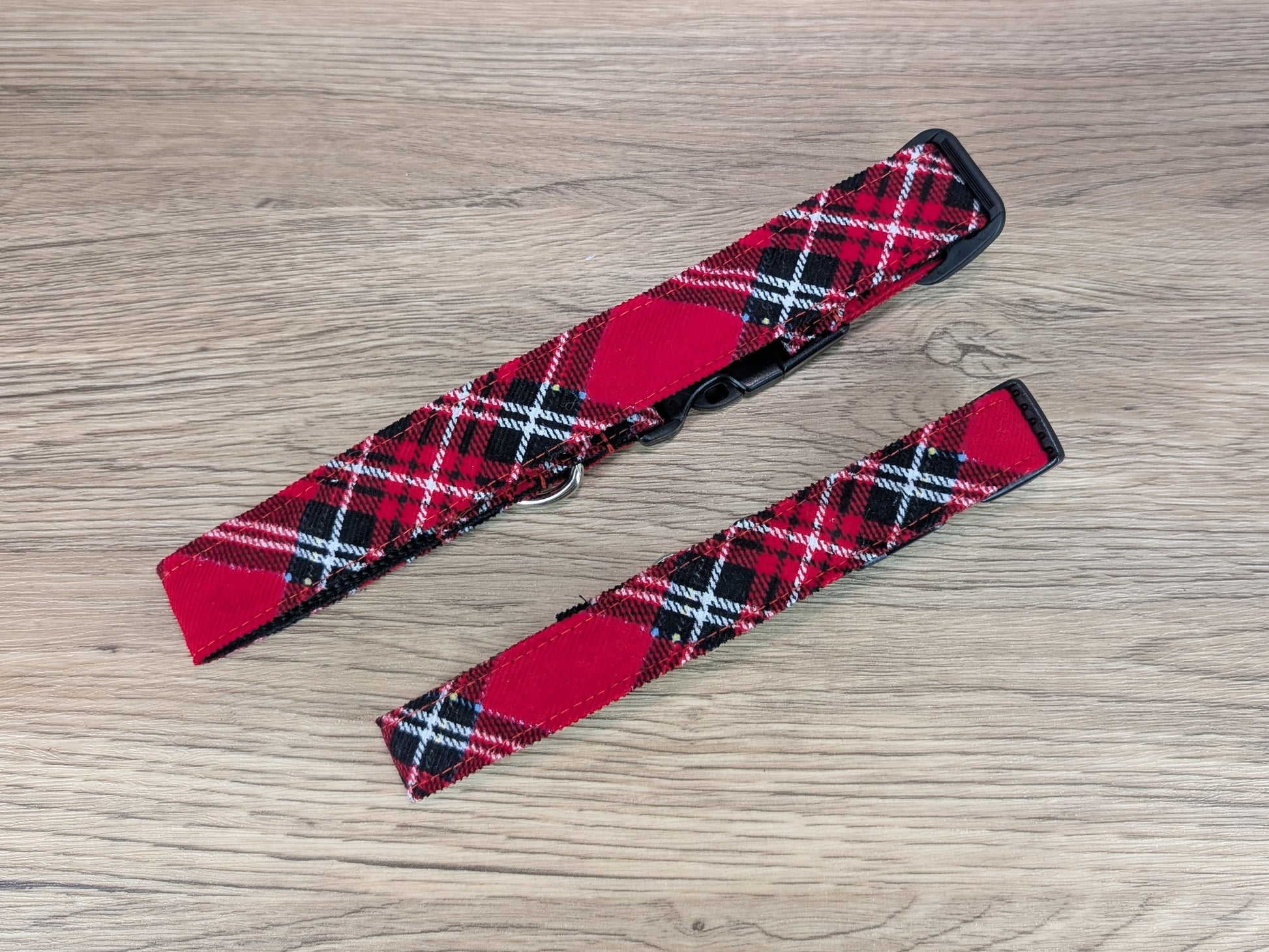 This handmade dog collar features red tartan fabric on black webbing, and has been tried and tested for strength and durability.