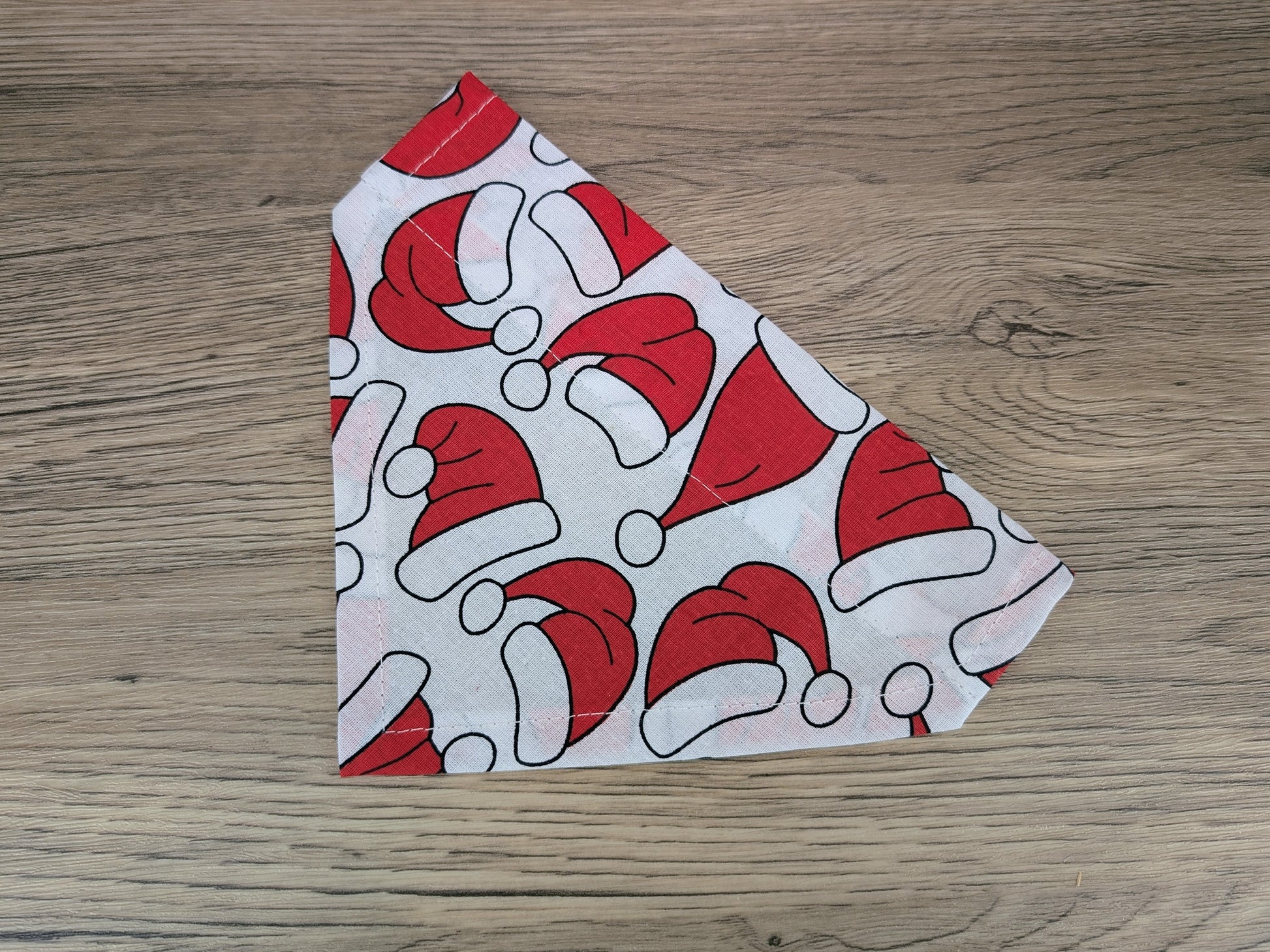 This designer detachable Barkley Dogwear dog bandana is handmade in the UK and features red Santa hats on a white background.