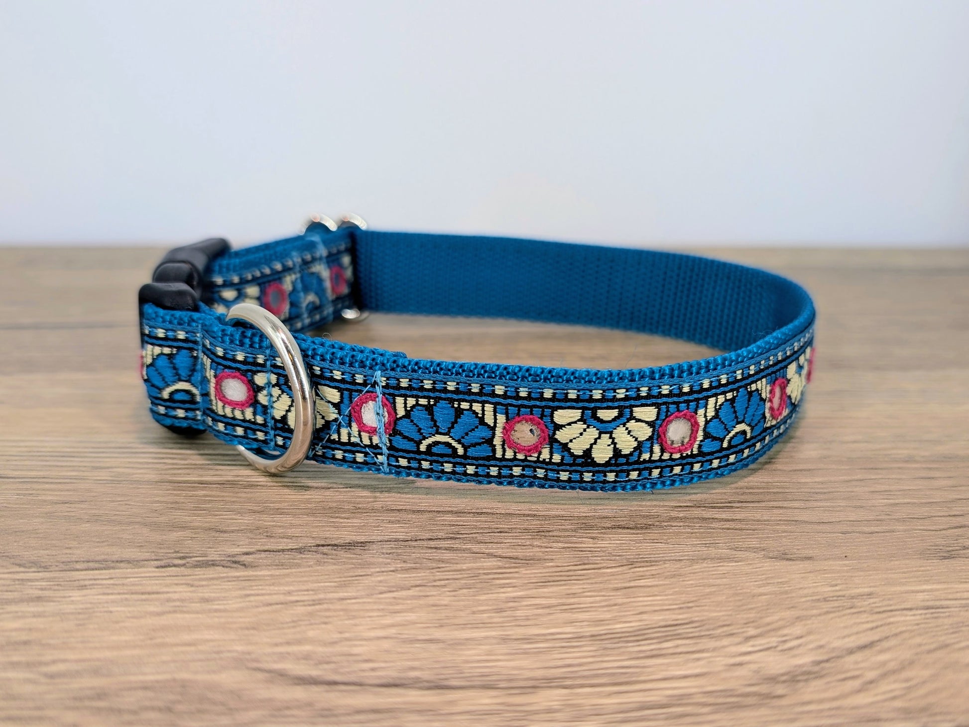 This designer dog collar is ideal for those who like a touch of elegance, featuring a turquoise pattern with tiny mirrors on a turquoise webbing.